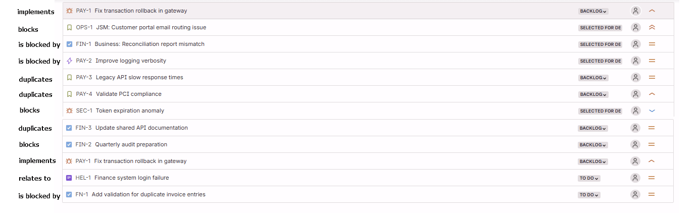 Jira does not provide validation rules or enforcement mechanisms. Teams can link any issue type using any link type, making it easy for incorrect or irrelevant relationships to accumulate.