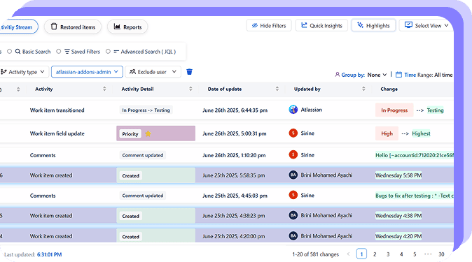 To make it even clearer, the app offers custom highlights: assign unique icons and colors to key change types like transitions, edits, or worklogs. Your data will not only be visible, it will be understandable at a glance.
